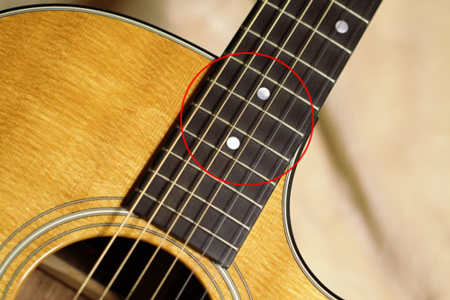 アコギの場合はネックと指板にポジションマーク(上の写真で赤い丸で囲ってあるモノ)が付いているのが一般的ですが、クラシックギターには、ポジションマークがなかったり、ポジションマークの数が少なかったりするモノも多いです。